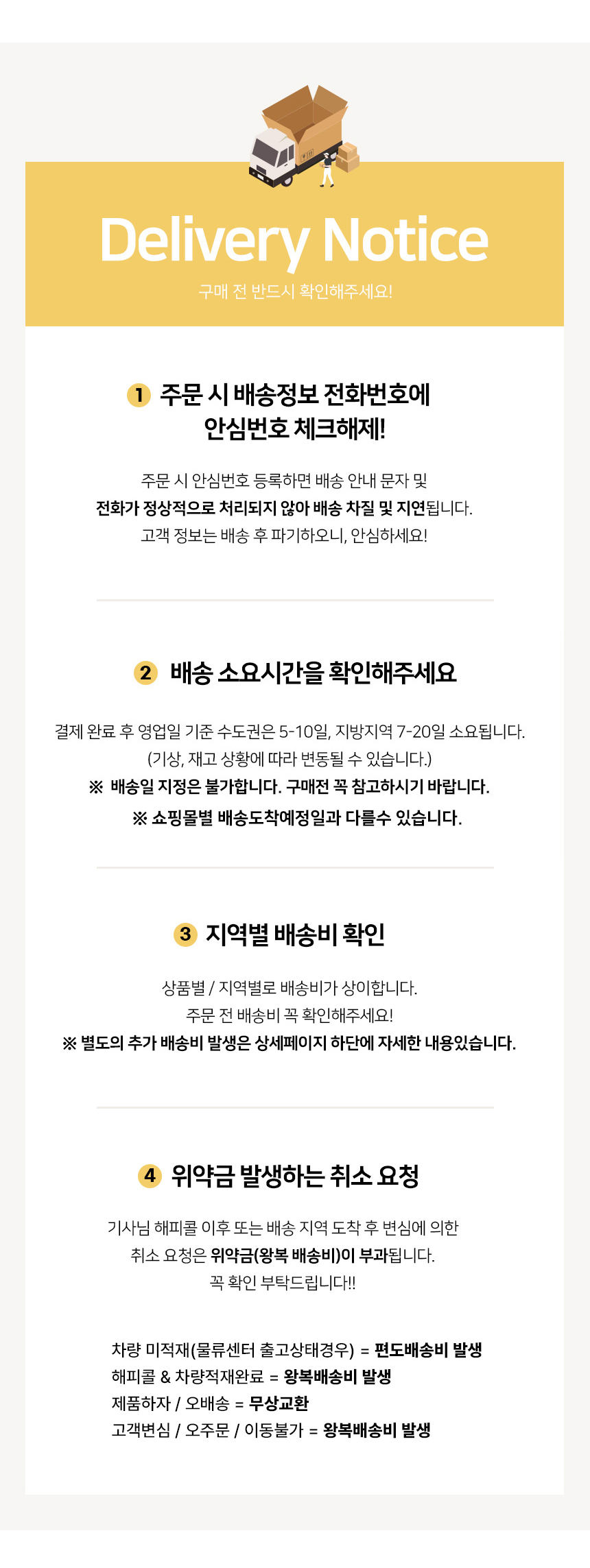 배송안내: 전국 배송이 가능하며, 토요일과 공휴일을 제외하고 평균 2~4일 소요됩니다.